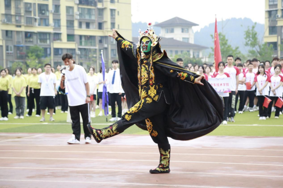 开幕式上,文化旅游学院方队的成员身着统一的服装,迈着整齐的步伐,带着昂扬的气势,伴着观众席中文旅学子共同喊出“文贯古今,旅行天下;文旅文旅,所向披靡”的响亮口号,在主席台前开始了本学院开幕式表演——川剧变脸、喷火,茶艺,书法表演,引得全场欢呼不断。