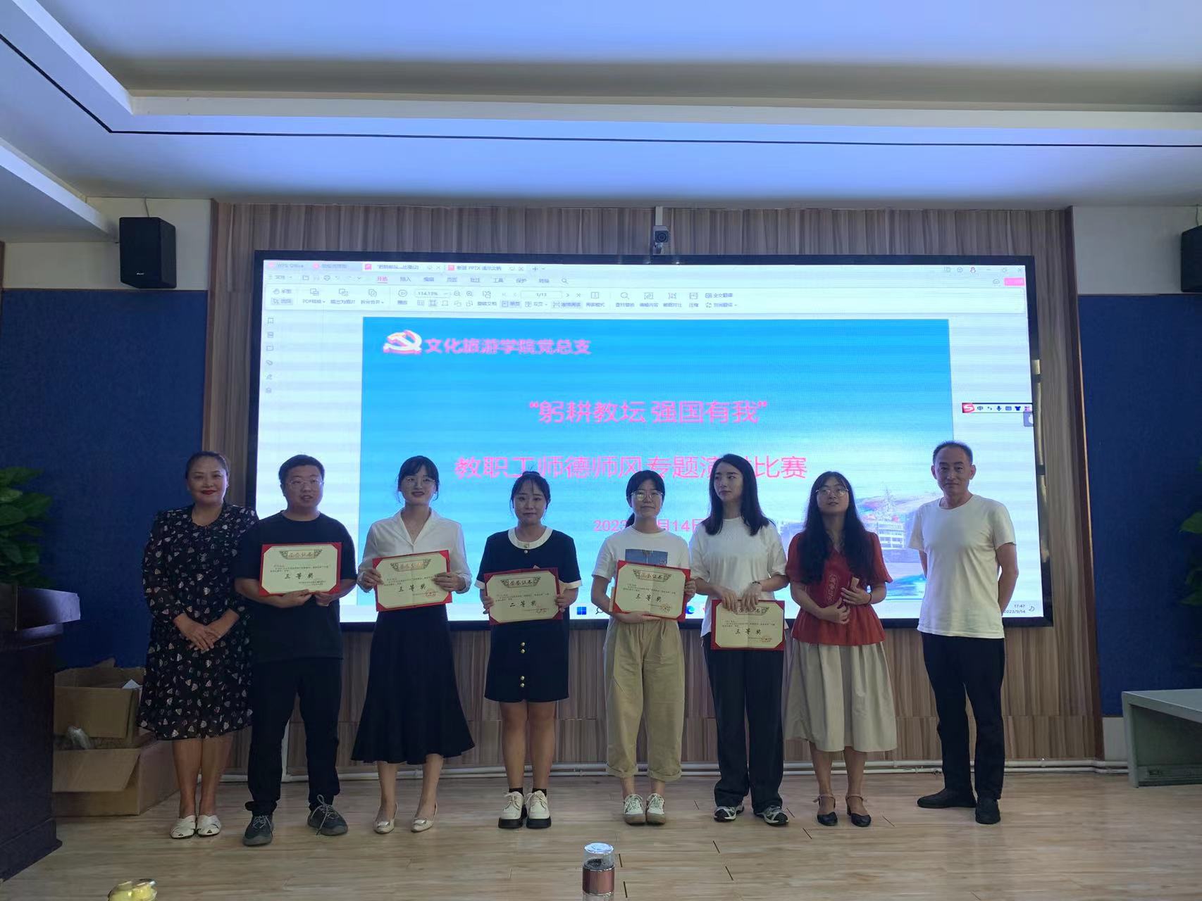 为隆重庆祝我国第39个教师节,进一步弘扬人民教师高尚师德,引导广大教职工把对党、对祖国、对岗位的满腔热情转化为实际行动,立足本职岗位作贡献,勤奋工作,勇于担当作为,文化旅游学院党总支于9月14日博雅楼M区103成功举办了“躬耕教坛,强国有我”教职工师德师风专题演讲比赛。院长罗莹、副院长唐元明、教师余平、曾晓洪、唐霞担任本次比赛评委,文化旅游学院全体教职工观看了此次比赛。