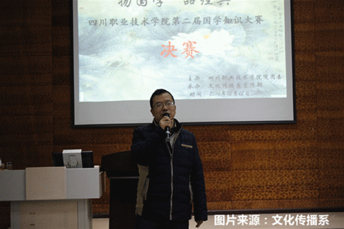 为继承中华民族优良传统,提升国学素养,弘扬和培育大学生的民族精神。2016年12月18日晚七点半,由院团委主办、文化传播系宣传部承办的“扬国学,品经典”第二届国学知识大赛决赛在我院五教411成功举行。莅临本次大赛的嘉宾有,文化传播系系主任杜春海、党政办公室主任罗莹、新闻教研室主任曾晓洪、语文教研室主任王光碧及文化传播系敬萍老师。参赛代表队分别是我院十个系,每系三名选手组成。我系16级部分班级同学观看了此次比赛。