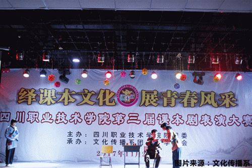 为丰富学生们的校园文化生活,感受文化乐趣。2017年11月22日晚7:20,由院团委主办、我系(文化传播系)团总支学生会社践部承办的以“绎课本文化,展青春风采”为主题的第三届课本剧决赛在我院二食堂三楼举办。文化传播系副主任唐元明、代理团总支书记李冬梅、汪辉、吴静、李静、袁小春、唐凡丁等老师出席了本次大赛并担任了评委,各系团总支学生会干部以及2017级部分班级观看了本次大赛。